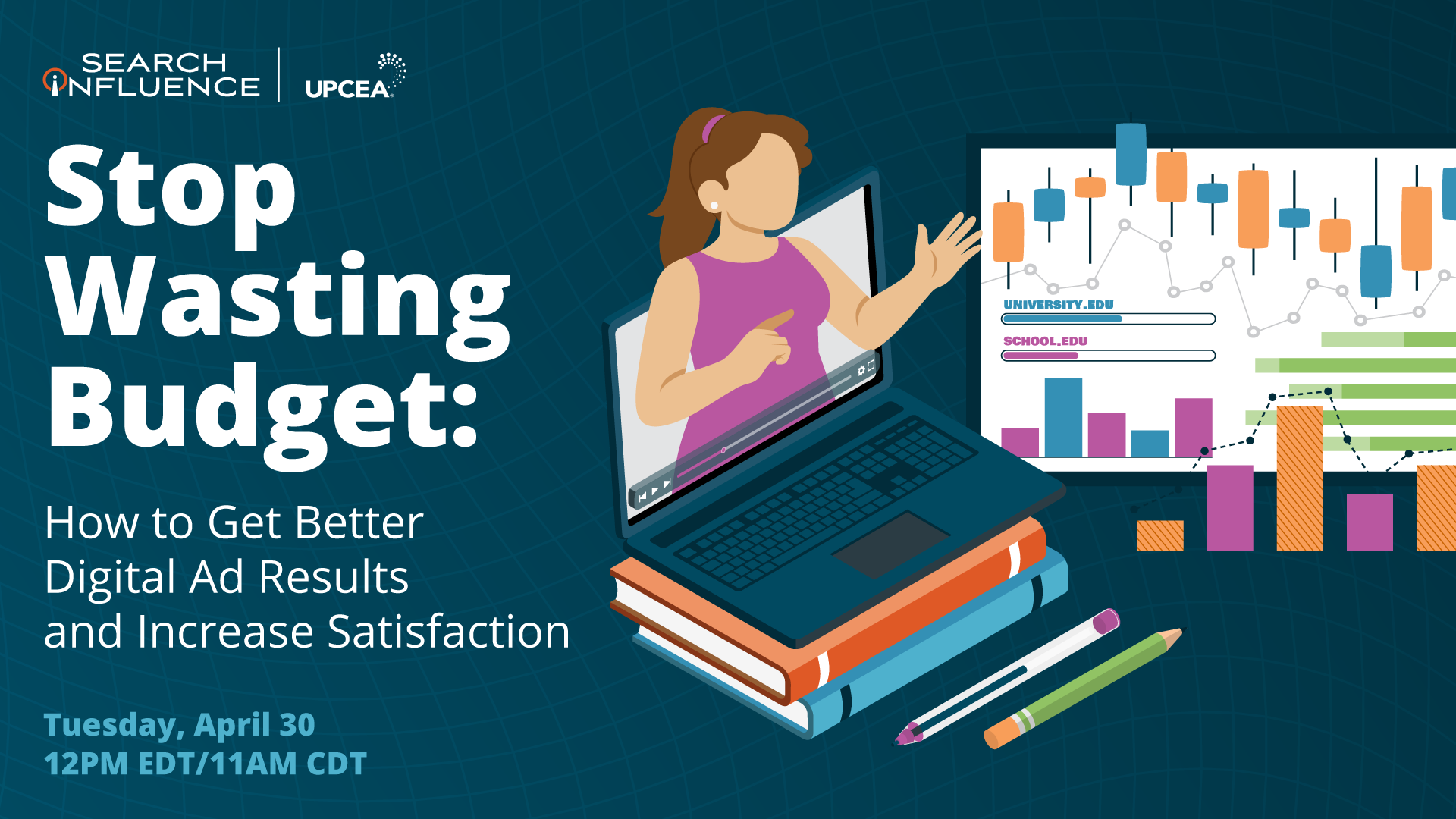 Join Search Influence and UPCEA on April 30 for the live webinar, “Stop Wasting Budget: How to Get Better Digital Ad Results and Increase Satisfaction,” to see how to maximize enrollment and minimize lost ad dollars at your university.