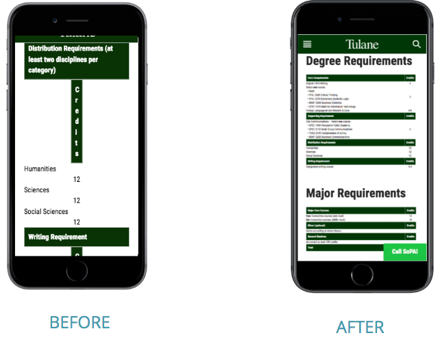 Beginning in the summer of 2018, Google rolled out their “mobile first” algorithm, making your mobile site more important than ever. Sometimes, developers edit websites on a computer without testing them on both a desktop and a mobile device. However, most prospective students will only visit your site on a mobile device. For Tulane SoPA, mobile traffic has increased from just under 43% in 2016 to nearly 75% in 2020.