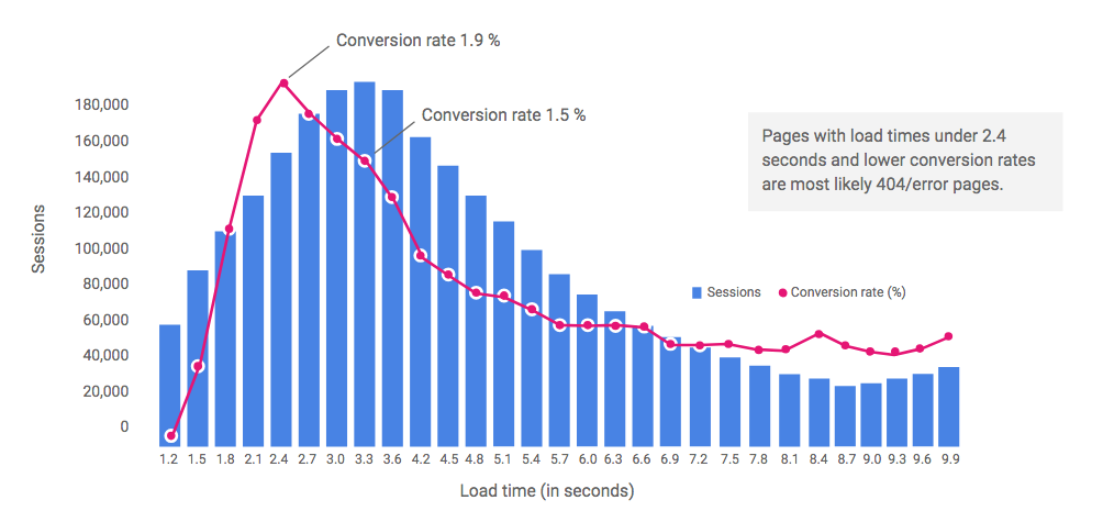 On a more positive note, sites with load times under 3 seconds garner the most sessions and peak conversion rates, showing that load time has a real impact on user experience and, therefore, conversion. The ideal load time is 3 seconds or less. Even just improving load time from 3.3 seconds to 2.4 seconds, you can increase your conversion rate by 27%.