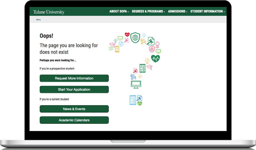 PRO TIP: Once you’ve worked on these four technical elements, create a custom 404 Page for your university’s site. When a user lands on a page that no longer exists, they’ll then be taken to a page on your site that can help them find the information they were looking for initially.