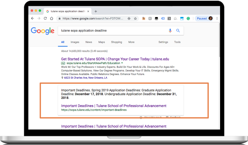 Help prospects and students find information more easily when searching for specifics like “Tulane SoPA Tuition” or “Parking on Smith campus” by optimizing for branded searches.