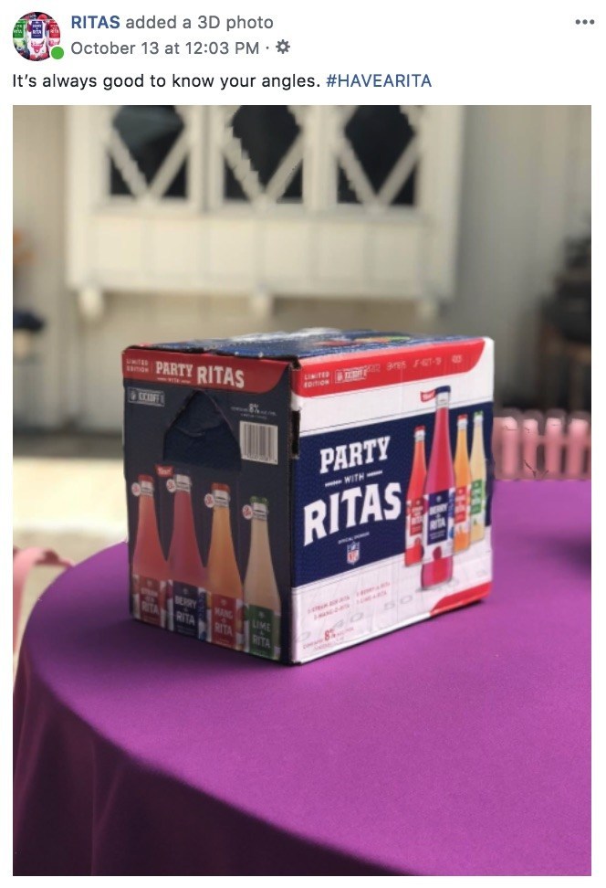 More casual images will look the most natural when using this feature. Your audience will be scrolling through their newsfeeds expecting the 3D image to be posted by someone they actually know, so keeping this in mind will help your brand seamlessly blend. The post below, for example, was posted by the official Bud Light Ritas Facebook Page and looks like it could have been posted by anyone celebrating the weekend or watching some football.