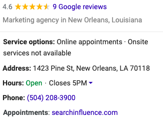 Screenshot of main business information on google my business listing