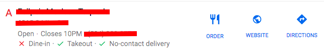 Screenshot of dine-in, takeout, no contact delivery attributes on Google My Business listing