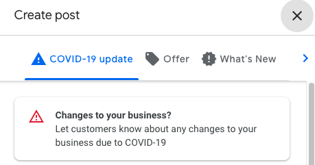 • There are two COVID-specific post options right now. Both of these are great ways to update users about the status of your business.