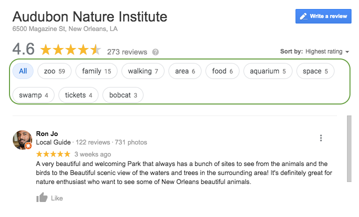 - Example: Here you can see that Google has aggregated keywords and phrases throughout the reviews to make it easier for a potential customer to see reviews that include venues they may want to visit. If a consumer wanted to see all the reviews that included the keyword “zoo,” they could select it and read up on the experiences others have had.