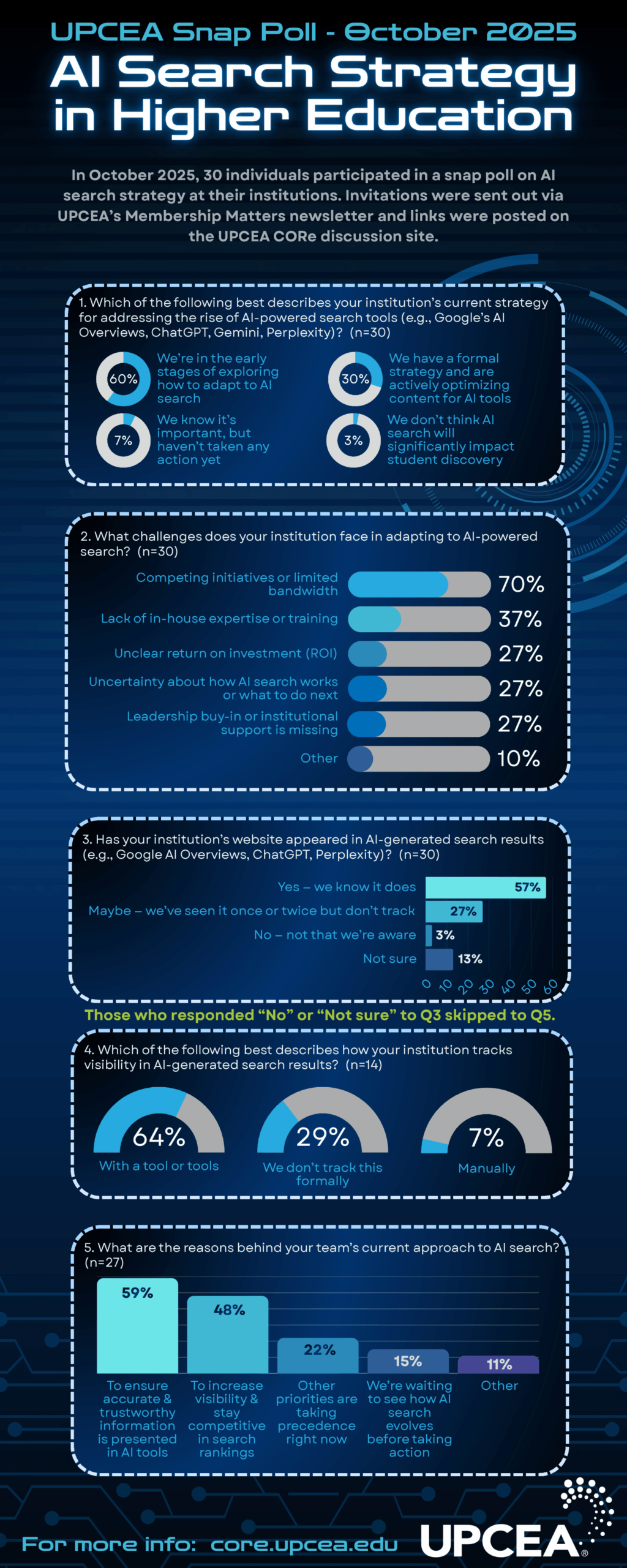 Institutional readiness varies widely. 60% of institutions are still in the early stages of exploring AI search, while 30% report having a formal AI search strategy. Despite growing adoption, only about 64% of institutions use tools to track visibility in AI-generated answers, highlighting a gap between changing prospect behavior and current measurement practices.