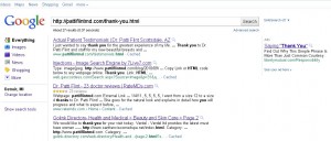 Before any search engine can see your backlinks, it needs to index the page containing them. Consider that search engines are constantly scanning the web for new pages to include in their index, which will be available for searching. To be considered for any search you need to be in that engine’s index. So how do you know if you’re indexed? The easiest way is to search for the actual URL in any search engine, like you see below. In this case, this Scottsdale plastic surgeon‘s Thank You page is not in Google’s index (which is fine because it has no value being there).