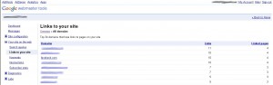 After you sign up and submit your site, your links won’t appear instantly, but will slowly accumulate. In the Dashboard, under Links to your site, click More. Then, under Who links most go to More and you can download a spreadsheet of all the links that Google is willing to admit to knowing about!