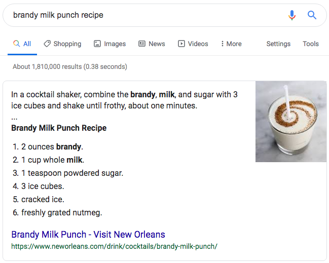 This structured data type will allow recipes to potentially display in Google search results with ingredients list and instructions.